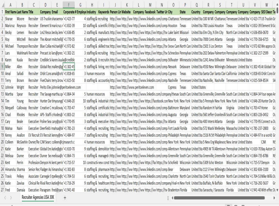 This comprehensive dataset includes 30,000 verified decision-maker contacts from recruiting and staffing agencies across the United States. Perfect for HR tech companies, job board owners, B2B service providers, and training institutes targeting key executives in talent acquisition, staffing, and human resource management.