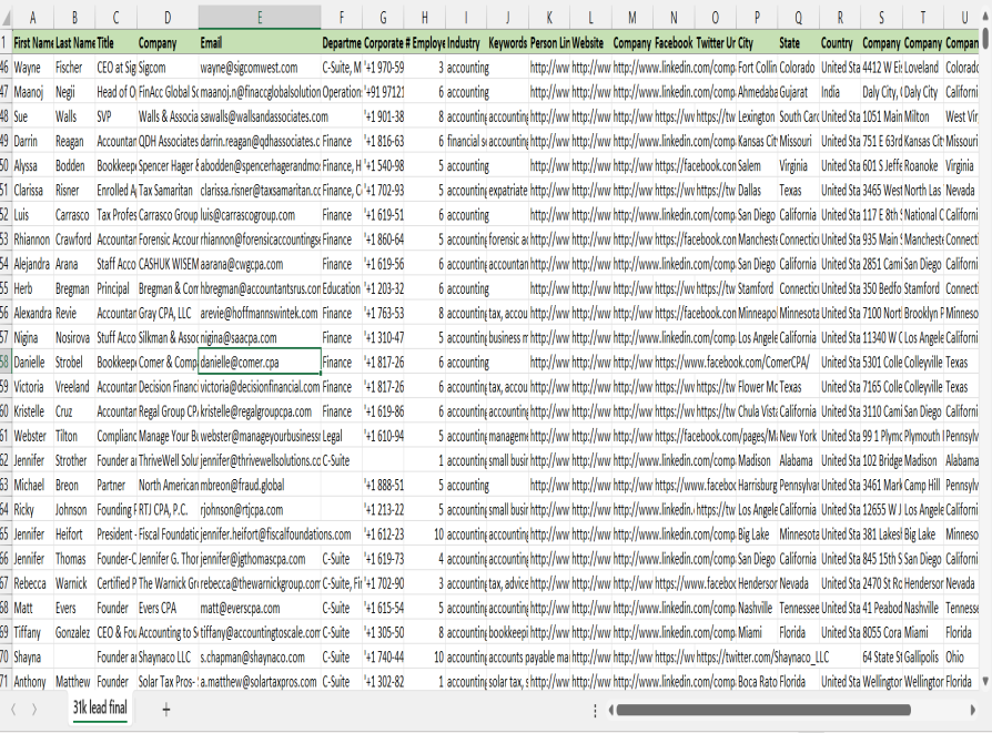 This premium dataset contains 31,000 verified contacts of Certified Public Accountants (CPAs) across the United States. Ideal for B2B marketers, tax service providers, accounting software companies, and financial consultants targeting licensed accounting professionals for partnerships, software sales, and industry-specific services.